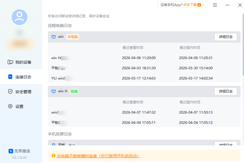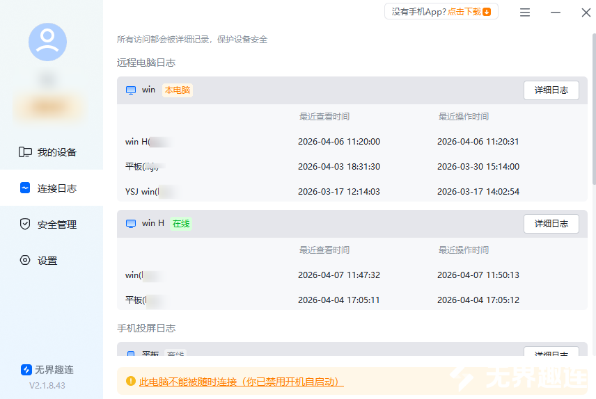 远程操控的安全的核心的就是可追溯,无界趣连2.0贴心设置了连接日志功能,让每一次远程操作都有迹可循。不管是手机操控电脑,还是其他设备间连接,所有连接时间、操作时长、操控设备等信息,都会详细记录在日志中,用户可随时查看、追溯,既能及时发现异常连接,也能方便日常管理,进一步守护隐私与数据安全。