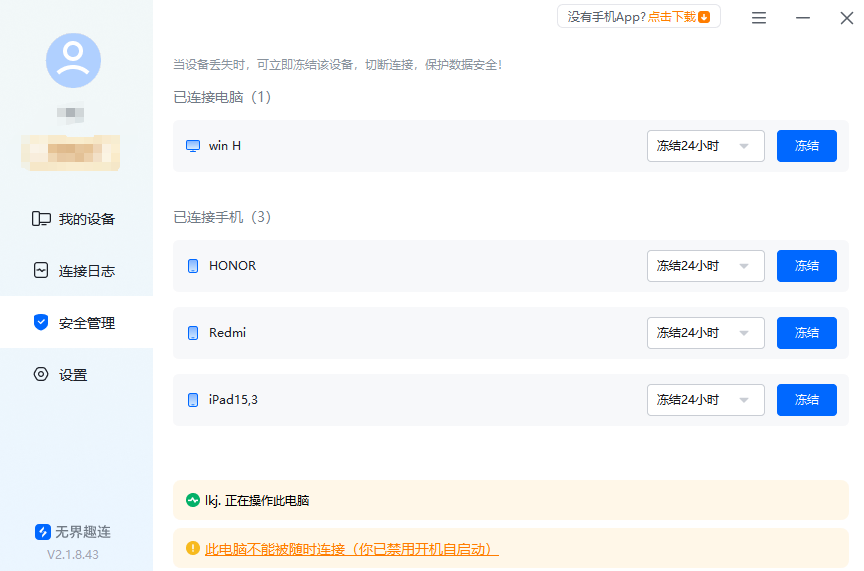 远程监控过程中,若被控电脑出现异常操作或面临安全风险,无界趣连2.0的冻结设备功能可及时止损。只需在手机控制端一键操作,就能快速冻结被控电脑,禁止其进行任何操作,防止他人非法篡改文件、窃取隐私。该功能操作便捷,能在突发情况下快速守护设备安全,让远程监控更放心。