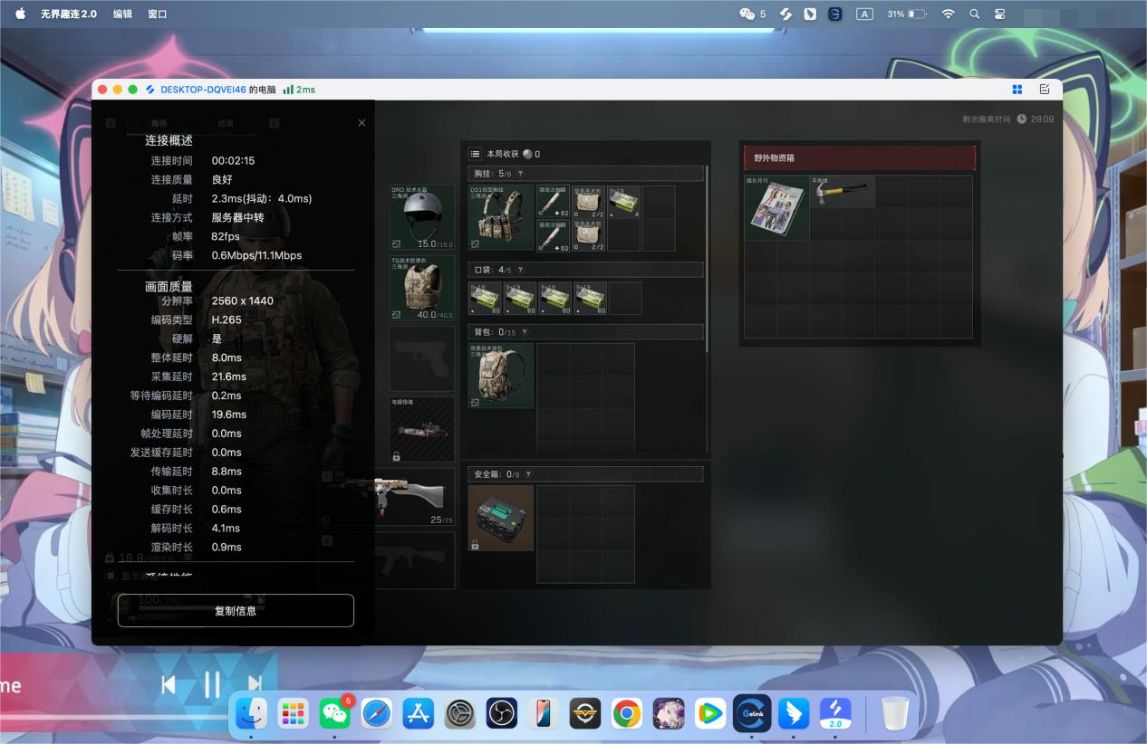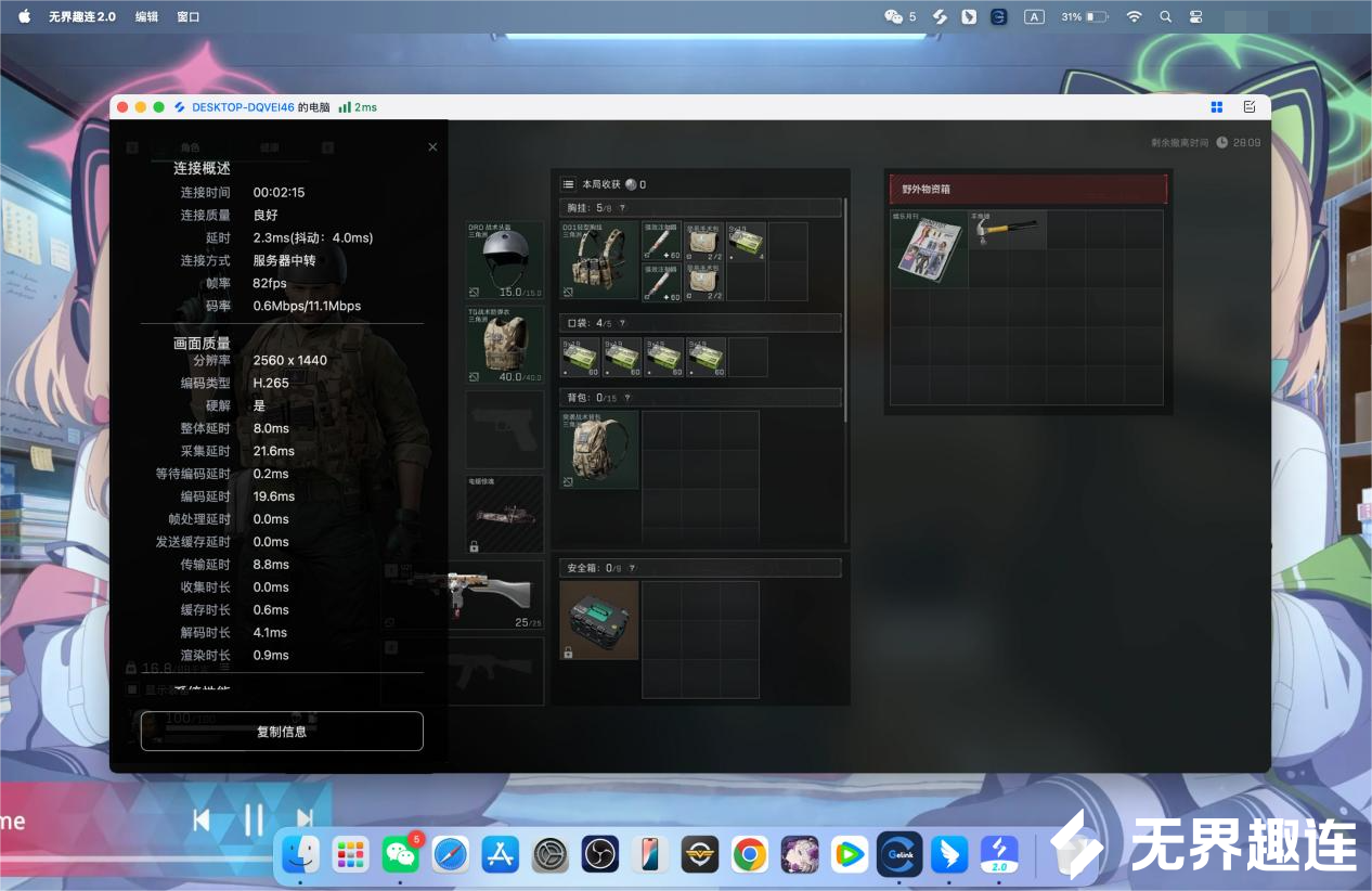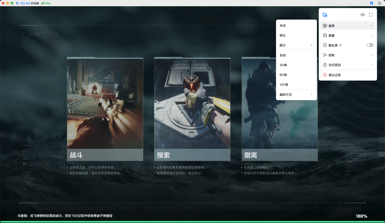 无界趣连2.0免费支持4K分辨率和120帧高刷传输,不用额外付费就能享受高清画质。用mac玩三角洲时,战场的草丛纹理、枪械细节、光影变化都清晰锐利,色彩还原真实,不会因远程传输出现画质压缩、模糊或拖影,让你精准捕捉敌人踪迹,提升游戏胜率。