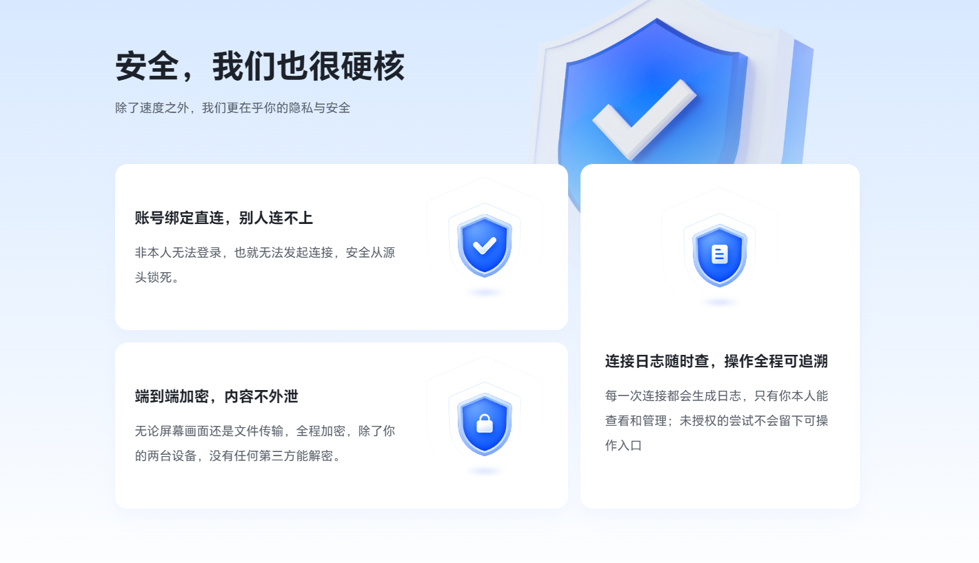 手机远程看另一台手机屏幕,隐私和数据安全是重中之重,无界趣连2.0采用端到端加密技术,全程保护数据传输安全,杜绝信息泄露。所有远程连接都需要被控设备手动授权,没有授权无法建立连接,同时还提供完整操作日志,方便用户追溯操作记录,全方位保障隐私与数据安全,使用起来更放心。